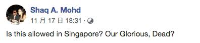 11月17日,脸书用户Shaq A. Mohd发布了这则视频,并附上了文字:这在新加坡是允许的吗?(“Is this allowed in Singapore? Our Glorious, Dead?”)。