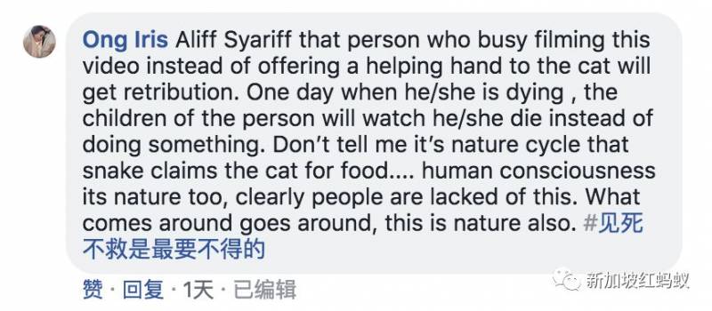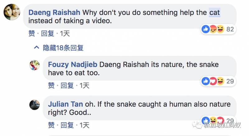 上周五(16日)有网友拍到组屋楼下蟒蛇公然勒死肥猫的视频,引起不少国人关注,甚至在网上争论,到底应该救猫还是不要救猫?