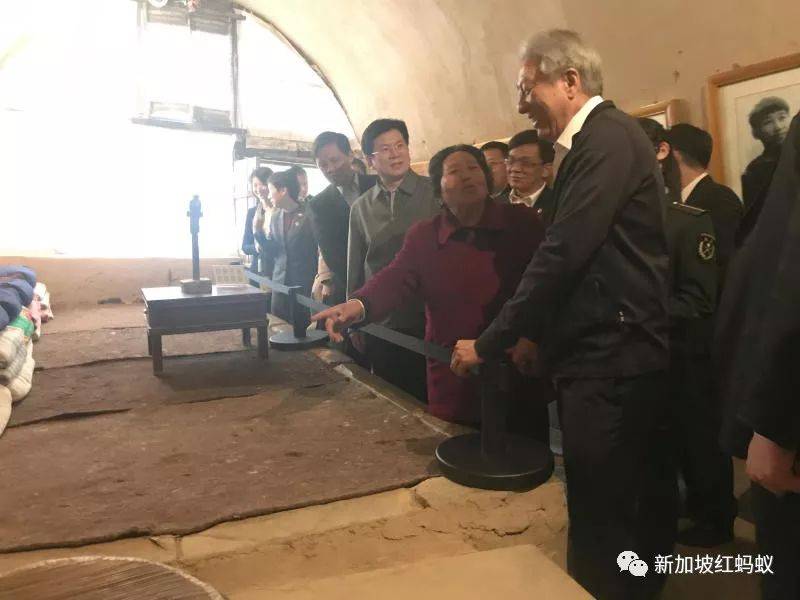 4月15日,访问中国的我国副总理兼国家安全统筹部长张志贤(右一)、贸工部长陈振声(右四)等新加坡政治职务担任者,在延安梁家河村参观中共总书记习近平1969年到1975下乡期间住过的一个窑洞,一名女村民(右二)向张志贤介绍洞里的设施和生活情况。(联合早报)