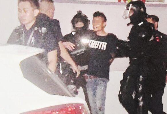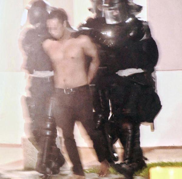 记者抵达现场,据观察,现场的封锁范围大约两个足球场,近百人围观,两名男子将自己反锁于屋内,不肯开门。两男在屋里与警员僵持不下,大闹了4个小时,警方在8时左右从事发单位逮捕两名男子,他们眼神呆滞。两名男子被警员带出来时,手被铐在背部,其中一名男子上半身赤裸,身材健硕。