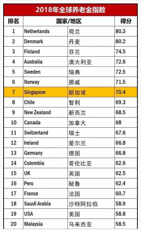 根据健康、财富和职业咨询机构美世(Mercer)公布的全球养老金指数,新加坡的养老金制度是亚洲第一的,在全球排名第七!