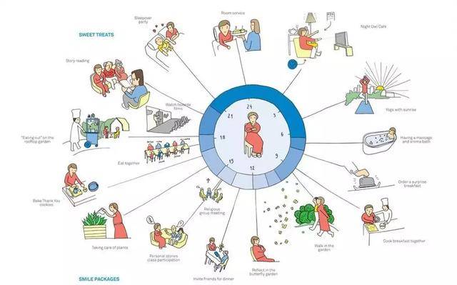 乐龄公寓的内外设施均按照老年人需求而设。另外,在一些细节上乐龄公寓也有针对性的精心设计。服务中心不仅配备有专业的医疗、护理人员,从身体和精神上帮扶老人,还时常举办各种娱乐活动,以丰富晚年生活。