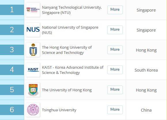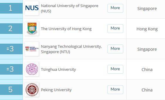 新加坡国立大学名列第一,香港大学跃居亚洲第二,紧随其后的是并列第三的南洋理工大学和清华大学