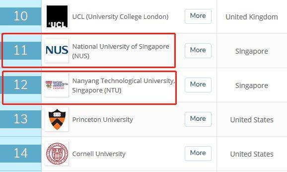 全新的QS世界大学排名中,新加坡国立大学和南洋理工大学分别取得了第11和第12的好成绩。两所学校的多个专业也排名全球第五、第六和第七,位列众多同专业的英美名校之上。