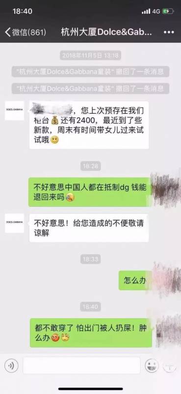 D&G的大陆线下门店这几天也是门可罗雀。别说有顾客下单,甚至VIP客户都要求退回预存款。