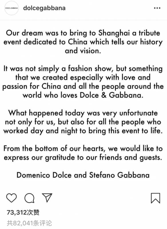 不怪网友一时难以接受道歉,因为此前D&G在ins上发布的致歉声明,一点都看不出有对不起的意思。