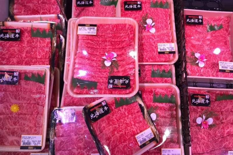 最吸引人的应该是来自日本的牛肉, 有北海道牛和黑毛牛,牛肉纹理红白相间,油脂分布均匀。