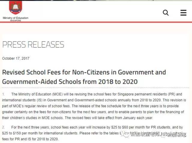 新加坡教育部(MOE)几个月前发布公文表示:将对在新加坡政府和政府资助学校读书的PR和国际学生未来三年(2018-2020)涨价,每月学费将上调新币25元至60元, 非永久居民的外籍学生每月学费上调新币25元至150元不等。