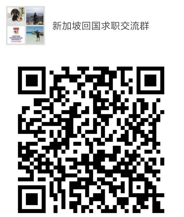 由国内求职机构专家组建,建群目的是希望帮助国内金融、咨询、快消、地产、互联网等超500家知名企业进行校招调研,了解新加坡留学生求职的困难和需求,帮助大家顺利回国求职,欢迎希望回国就业的同学进群交流!