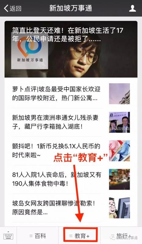 广告1. 进入万事通公众号,在底部菜单栏选择“教育+”。