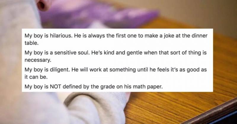 可是男孩的妈妈并没有感到失望。相反地,她认为自己的儿子是最优秀的,她还特意在Facebook上为儿子写了一篇文章: