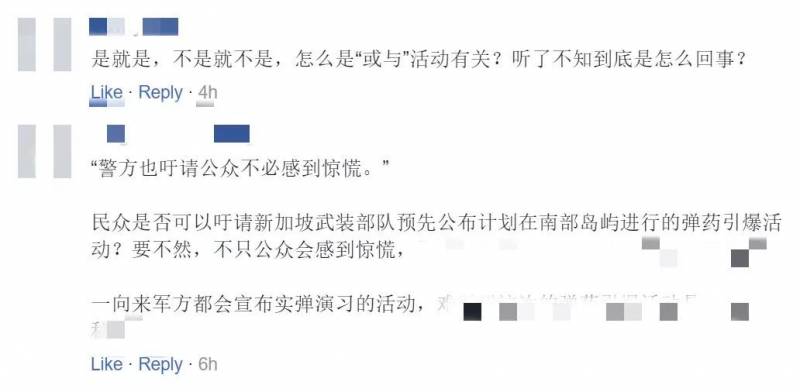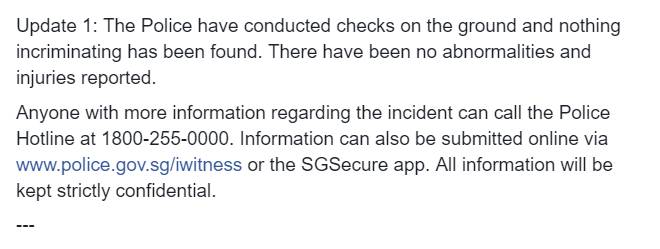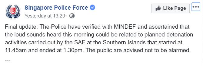 “最后更新:警方和国防部核实,这些早上听到的巨响,可能和武装部队在南部岛屿展开的爆破行动有关,爆破从11:45开始下午1点半结束。警方提醒民众不要惊慌。”