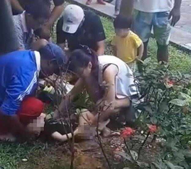 盛港组屋一名2岁男童从11楼飞坠,倒卧在草地上。(取自面子书)