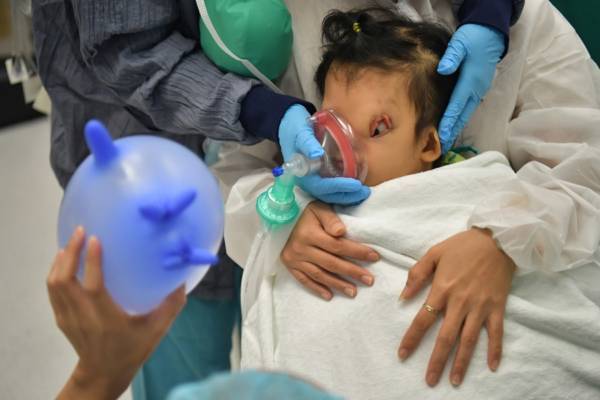 孙女黄勇吸入麻醉气体的当儿,一名护士在她面前摇晃一个充气手套以吸引她的注意力,直到她失去知觉为止。(海峡时报星期刊)