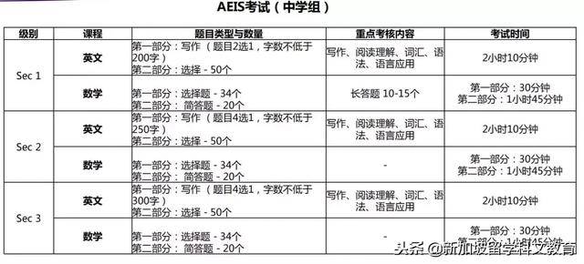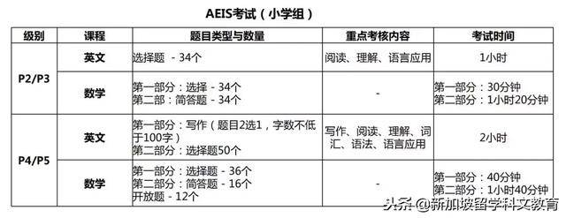 AEIS( Admissions Exercise for International Students )是新加坡教育部举办的新加坡政府中小学国际学生统一入学考试,考试对象是想进入新加坡政府小学和中学的学生,考试包括英文和数学,都以英文作答。