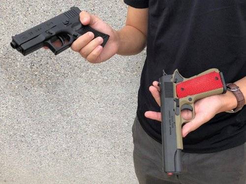 仿造的Glock手枪(左)和1911式手枪。当局2018年四次出击,没收了通过网购运来的软气枪或晕眩枪包裹。(海峡时报)