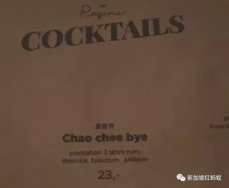 第一杯鸡尾酒叫:Chao Chee Bye(CCB)菜单上的中文字写着:臭膣屄