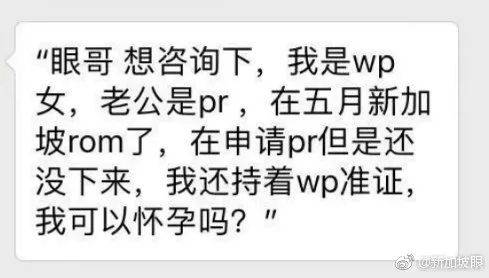 有网友问新加坡眼,她持WP准证,和PR老公5月在新加坡领了结婚证,目前正在申请PR,还没批,那这种情况可以怀孕吗?