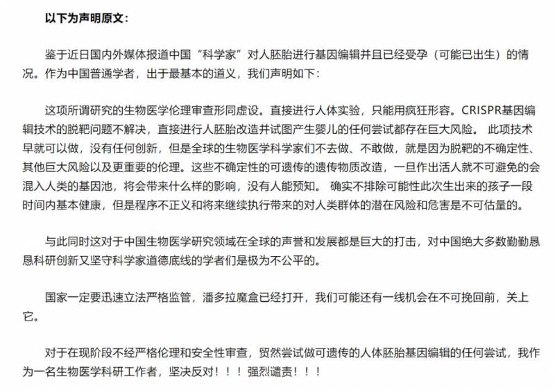 新加坡A*STAR(新加坡科技研究局)研究员傅玉还签署了全球112名科学家的联合声明,强烈谴责基因编辑。