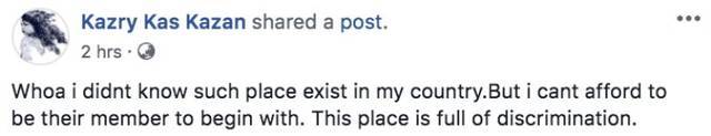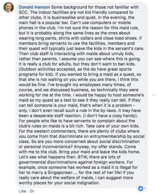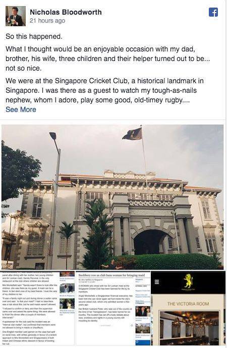 近日,本地一位网友Nicholas Bloodworth在脸书上发长文分享了自己在一间颇有历史的俱乐部里的一段不愉快遭遇,原因是家人的女佣被工作人员要求不准入内,且必须在停车场等候。