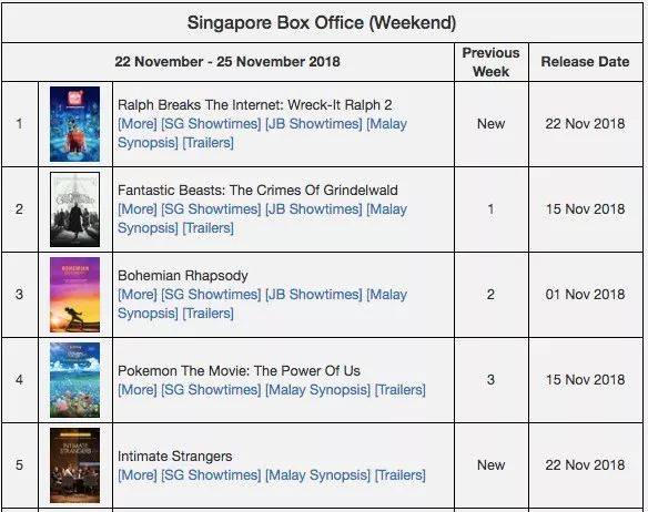 先看票房,上周《无敌破坏王2:大闹互联网》上映直接荣登榜首,《神奇动物:格林德沃之罪 》位居第二,《波西米亚狂想曲》上映4周,排名第三。《精灵宝可梦:大家的故事》,滑落一位,占据第四,《完美陌生人》名列第五。