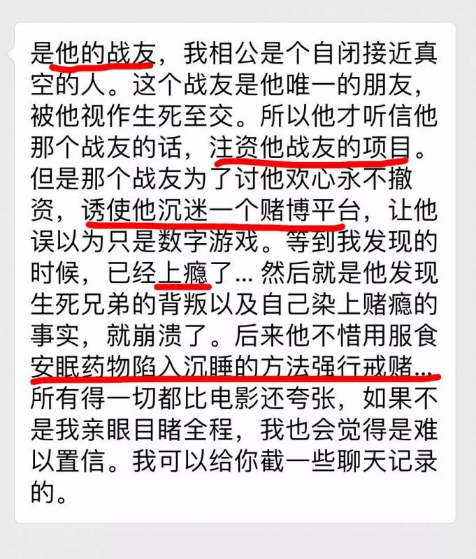 王某投资了他的项目,为了留住王某这颗摇钱树,战友引诱他沉迷上一个赌博平台,这让王某很痛苦,于是不久前王某决定撤资,彻底惹恼了这个战友。