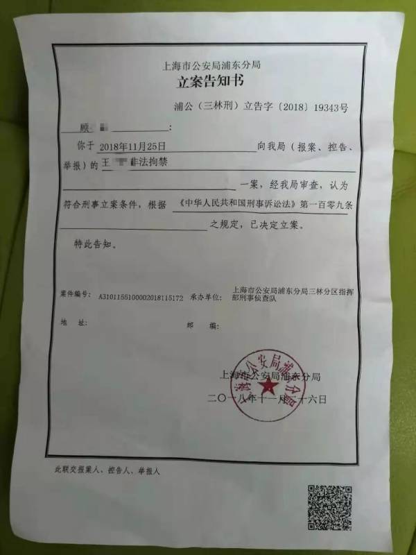 11月25日,她还去上海公安局报了警,警方已经立案着手侦查: