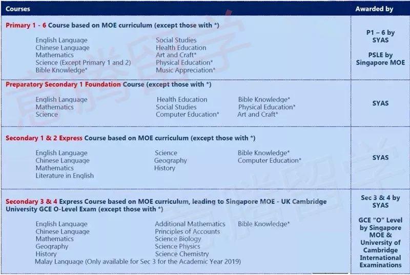 所有课程是严格遵循新加坡教育部大纲,学生在小学或中学毕业时,将参加新加坡政府的统一考试。