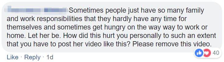 (有些人可能因为担负着沉重的家庭和工作责任,以至于他们几乎没有时间好好吃饭,只好在上班途中或回家路上偷偷吃点东西。她对你的个人利益造成了什么伤害,以至于你需要这样发布她的视频?请删掉此视频。)