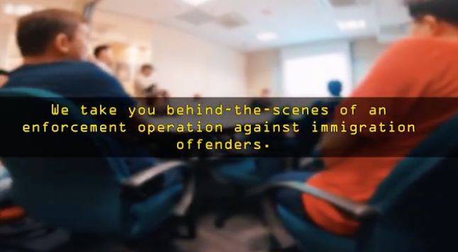 视频拍到,执法人员敲门要求房里的人开门,执法人员指出“里面的灯开着”,房间却无人应门。到了凌晨5时30分,执法人员还在搜查店屋附近是否还有匿藏客工,铺下天罗地网,最终查出店屋竟然住了约100名客工,当中相信包括逾期逗留者。视频也指出,涉及非法入境或逾期逗留者将触犯移民条例,若被定罪,可被判监6个月,鞭打至少3下。