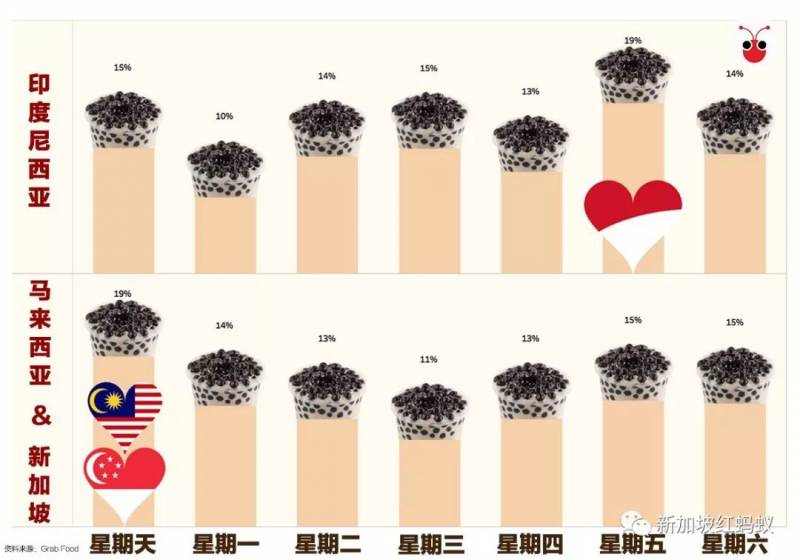 关于泡泡奶茶的部分,GrabFood还发表了一张有趣的图表,显示新加坡人和马来西亚人都喜欢在星期天通过外卖点泡泡奶茶,印尼人则喜欢在星期五下单点泡泡奶茶。这是否意味着印尼人在周末来临前都喜欢有个“甜蜜的开始”,而新加坡人和马来西亚人则喜欢有个“甜蜜的结尾”呢?