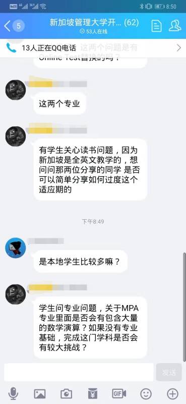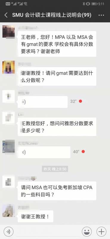王教授以会计行业的传统优势和发展讲起,从行业的变革、学术界顺应大势而做的调整,讲到SMU会计专业研究生课程的优势、申请细节。一个多小时不间断的语音讲解后,教授还在群里解答了同学们的疑惑。