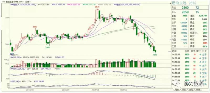 2018年11月26日至11月30日燃料油期货1901主力合约收盘价格比前一周收盘价大跌194元或者-6.35%,至每吨2859元。期货价格创下上市以来新低2832元。价格走势符合上周预测的继续下跌趋势和探寻底部。由于美国原油库存连续增加和欧佩克减产的不确定性,上海SC原油期货价格周线七连阴,下跌3.44%至418.1元,也带动了燃料油期货连续三周大幅度下挫。其它大利空是截止11月28日当周新加坡残渣燃料油库存大增102.5 万桶至1892.8 万桶,连续两周增加。新加坡套利船货增加,现货升水和原油裂解价差都出现下降。