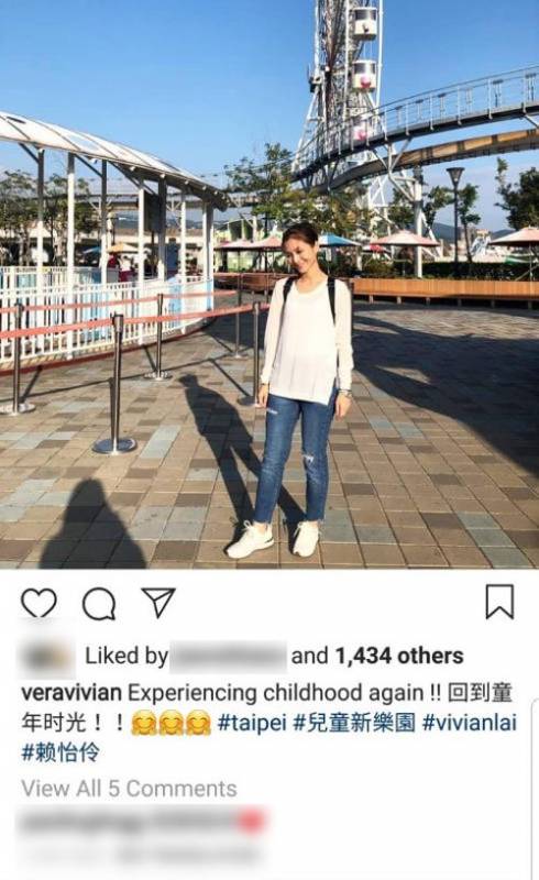 赖怡伶前天在Instagram上载她在台北市立儿童新乐园的照片,以摩天轮为背景,而她则低头微笑,心情看起来轻松,还写道:“回到童年时光!!”