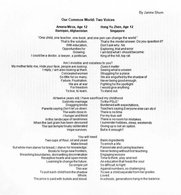 一名12岁的阿富汗女孩和一位12岁的新加坡学生在Janine的笔下,进行了跨时空的对话。