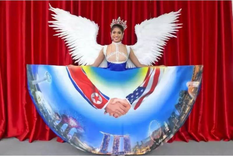 裙摆上印着朝鲜和美国两国的国旗。那双紧握的双手,不正是今年6月,特朗普和金正恩在新加坡的“世纪之握”吗!