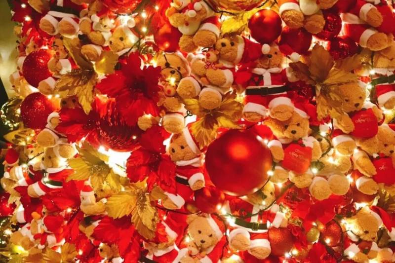5米高的圣诞树,装饰了满满的泰迪熊,在手摇铃声中开启了点灯仪式。
