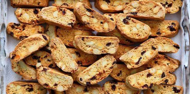 诞生于中世纪托斯卡尼地区的传统点心,由各类干果或坚果制成的杏仁风味硬饼干,从里到外酥香爽脆。被咬断时还会发出细小的声响,因此命名时便参考了在意大利语中有着“微弱的歌声”这个意思的单词“Cantocci/Cantucci”。由于太硬,意大利人常常把它浸在餐后葡萄酒(例如意大利甜白葡萄酒“Vin Santo”)或咖啡等饮料中,泡软之后再取出食用。