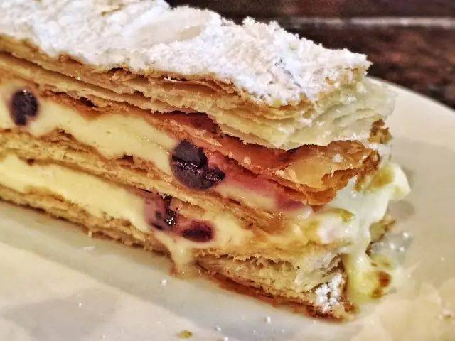 外交官方糕的名字取自一位意大利帕尔玛市的外交官,后流行于整个意大利,尤其以帕勒莫市烘制的最为经典。长方形的两层薄薄的千层酥皮中间抹上厚厚的生奶油和甜奶油,除了长方形糕点外还有圆形的蛋糕。外形上确实有点像拿破仑千层酥~谁让意法不分家呢!