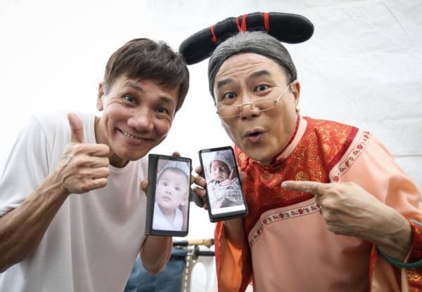 两个外公梁志强和王雷在后台就上演“公斗”剧,互比谁的外孙比较可爱,脸上尽是自豪!