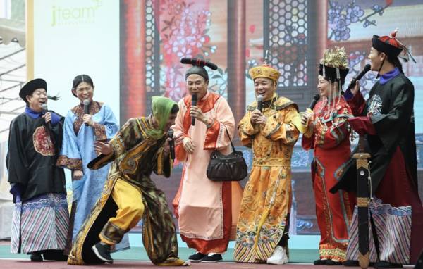 梁志强等人为宣传《欢喜就好4》,昨天下午在牛车水广场(Kreta Ayer Square)以《延禧攻略》中的角色登场,梁志强以梁婆婆身份扮演魏璎珞,王雷扮演贵妃,辉哥(程旭辉)扮公公,陈建彬是皇上,蔡礼莲则是皇后。