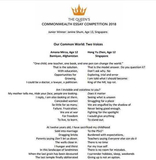 2018年英联邦写作大赛获奖名单新鲜出炉,新加坡13岁的天才少女Jannie Shum凭借一首发人深省的诗—One Common World,Two Voices(一个世界,两种声音)获得了中级组的冠军。