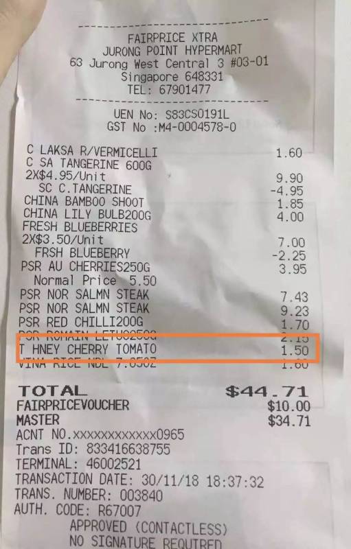 网友晒出了超市小票,小番茄是在Jurong Point的Fairprice里买的。因为已经嚼成了这样,网友表示:“要明天拿着去找他们的话还得把这坨垃圾带着虫保存好留一晚上,感觉不值得”。