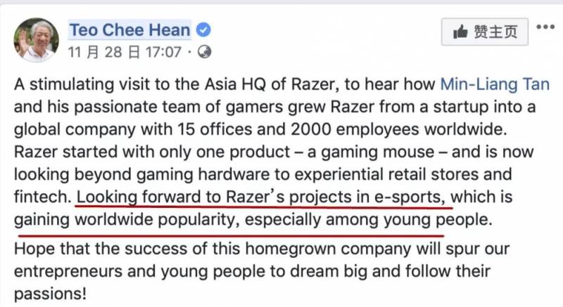 张志贤还在脸书上写道:电子竞技在全球范围内越来越受欢迎,尤其是在年轻人当中,期待雷蛇在电子竞技领域的发展。希望这个本土公司的成功能够激励我们的企业家和年轻人去追求梦想和激情!