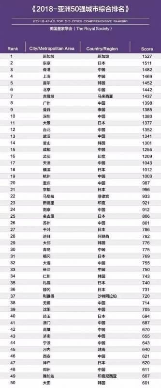 近日,英国皇家学会公布了2018年度亚洲50强城市综合排名。在这份榜单中,新加坡力压东京、香港、上海等城市位列亚洲城市第一位。新加坡整个国家就是一个城市,是亚洲的发达国家之一,也是世界三大金融中心之一。新加坡都没有香港大,人口也才540多万,就是这样的一个城市,却能成为亚洲综合实力第一强城市。