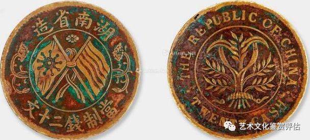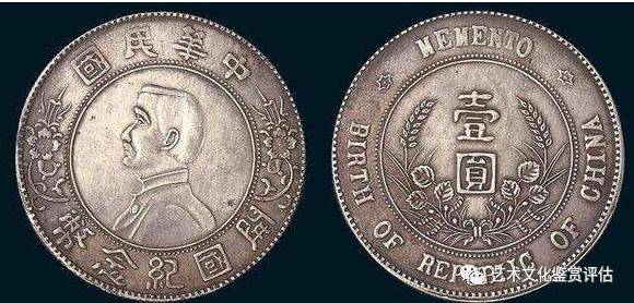 此币正面中间印孙中山头像,头像上方印字“中华民国”,头像下方印字“开国纪念币”,两字中间各有一幅梅花图案,背面中间有“壹圆”字样,字两侧为麦穗图案,字上下方各有一行英文字母,英文字母两侧各有一个六角星纪念币。