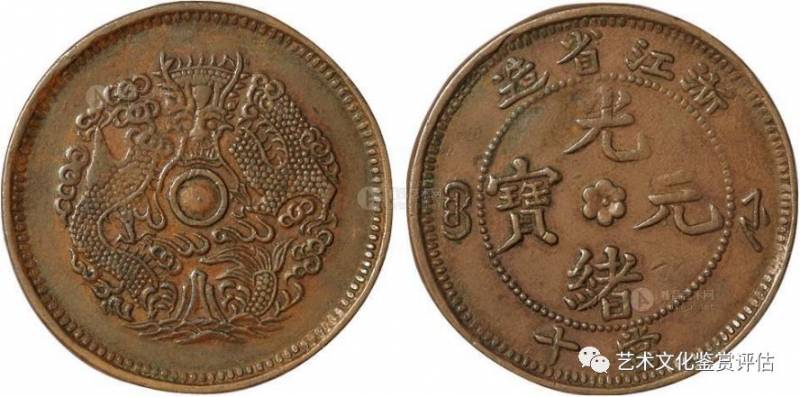 1902年浙江省造光绪元宝当十铜币红铜样币,NGCSP65RB,是英国伯明翰造币厂代中国试铸的四款铜币之一,与《伯明翰造币厂史》一书中着录的样币版式完全相同,而与浙江水龙流通版有所差异。据考,浙江铜元模具应是由英国著名镌刻师艾伦·韦恩(AllanWyon)设计,而同年又接获湖北省的订单,因浙江与湖北两厂所要求的开制时间很是紧迫,以是,艾伦·韦恩极有可能将已经设计好的“浙江当十水龙”龙模配上新设计的湖北当十币面,以完成模具预审的第一阶段,“湖北圆珠龙”样币(俗称“湖北浙江龙”)就在这样的情形下应运而生。“圆珠龙”应该是该镌刻事情室最后完稿留档之品,与流通版完全一样,应该就是它们的直接祖先。而此版浙江当十水龙试样,应可算是流通版的始祖。此样币以镜面版底精铸,图案镌刻极尽细腻,版底无瑕,光可鉴人,状态之佳臻于至境。此样币最早泛起于2003年秋季北京拍卖会,拍卖公司直接征集自日本著名铜币珍藏家秋友晃,现藏家则购自于该场拍卖会,后收入由周沁园、李平文编著的《中国机制铜元目录》,编号ZJ.41,级别为试样1级,十分珍罕。