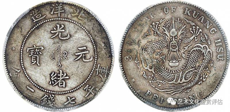 此币正面中央珠圈内镌满汉文“光绪元宝”四字,珠圈外上端镌汉文“北洋造”,下端镌币值“库平七钱二分”,左右两端各镌一个圆点,背面中央镌蟠龙图,上环镌英文“光绪34年”,下镌英文“北洋”,左右两端稍下侧各镌一个圆点。