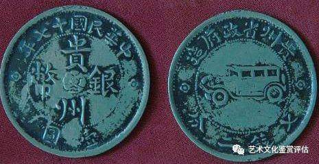 广告贵州汽车币, 直径:39mm 重量:26.7g 等级:5级,正面中央为“贵州银币”上铭“中华民国十七年”,下铭“一圆”:背面中央为草地、汽车图案,上铭“贵州省政府造”,下铭记重“七钱二分”,是民国十七年(1928年)贵州造币厂为纪念贵阳-桐梓公路通车而制造的,草地内含当时省政府主席周西成的“西成”2字。市场价值很高,市场上仿品泛滥。它的汽车图案是贵州的第一辆汽车,是周西成从香港购来的美国福特牌敞篷汽车。由于贵州没有公路,这辆汽车是拆散后,人挑马驮运入的。银币上的汽车图案即以此车为原形。用汽车作银币图案,是近代银币中绝无仅有的