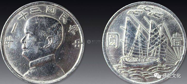 此币通体为雪花银铸造,正面上端铸有“中华民国二十一年”字样,下端为孙中山侧面像,背面中央两端铸有“壹圆”,中间有一双桅帆船正乘风破浪。
